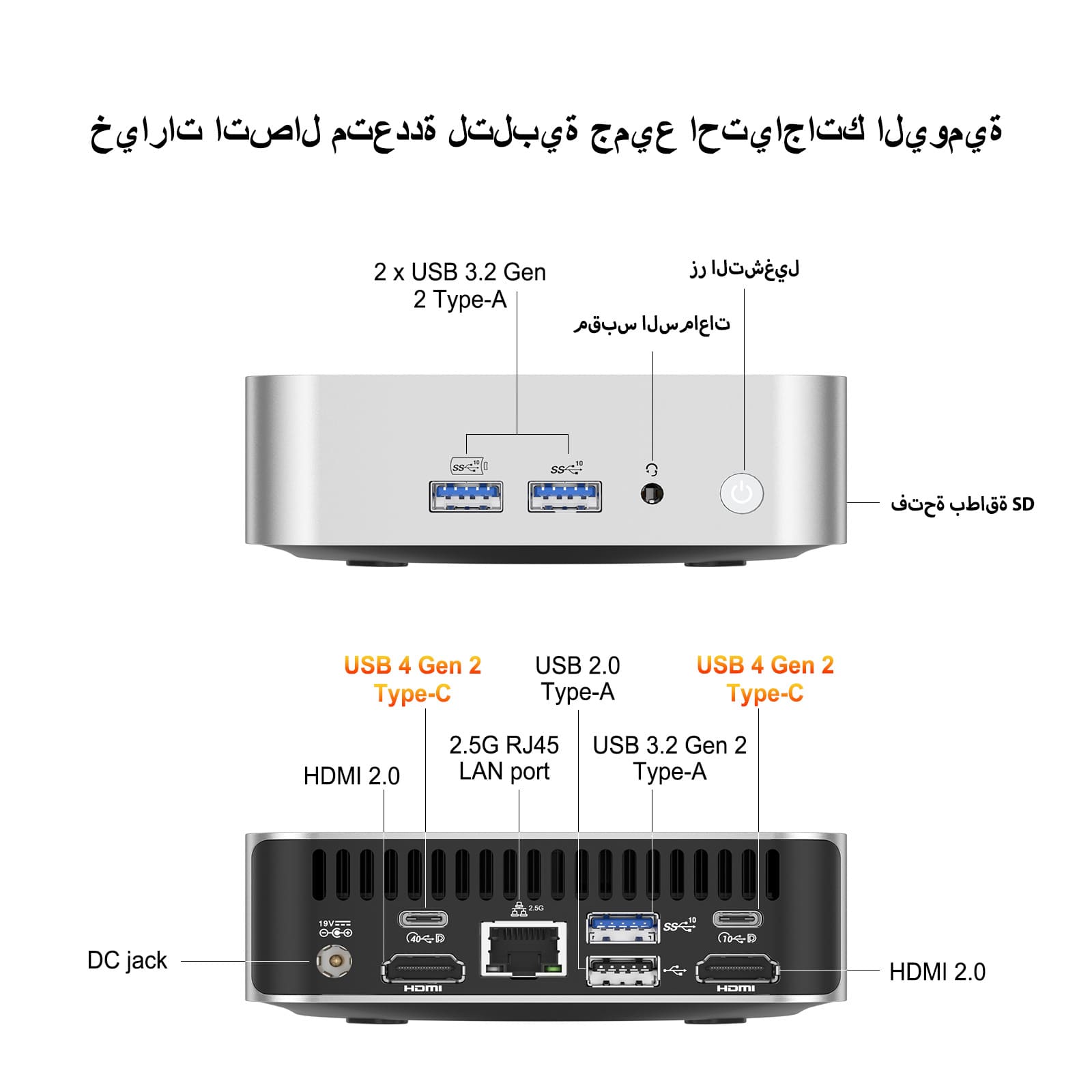 - واجهات غنية– 6 منافذ USB، قارئ بطاقات SD وقفل Kensington، ويدعم توسعة 4 شاشات عبر منفذي USB4 ومنفذي HDMI (بدقة تصل إلى 8K)